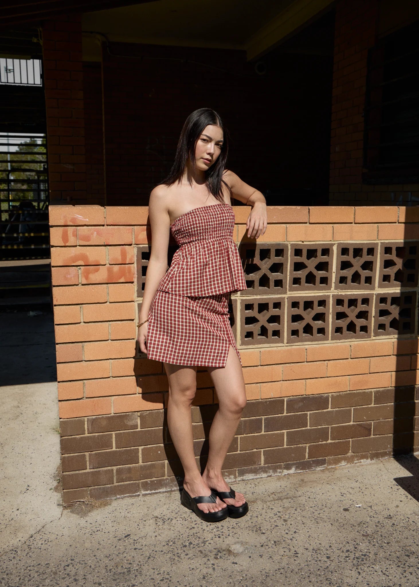 Introducing the 'Austin' collection in Red Rum, our latest custom yarn dyed woven check in a rich red tonal palette. This mini skirt is designed with a high waist, subtle thigh split and invisible side zip.
