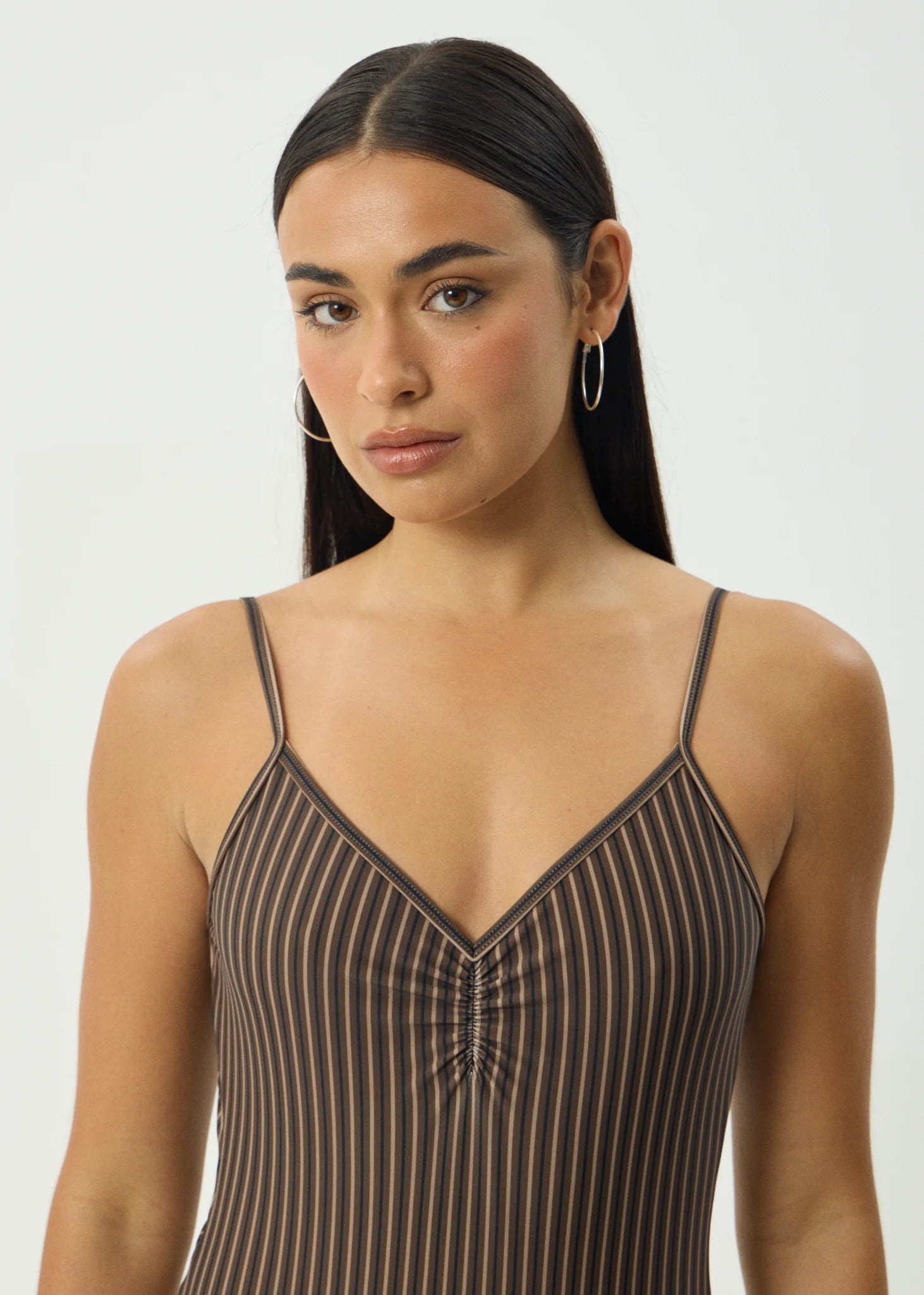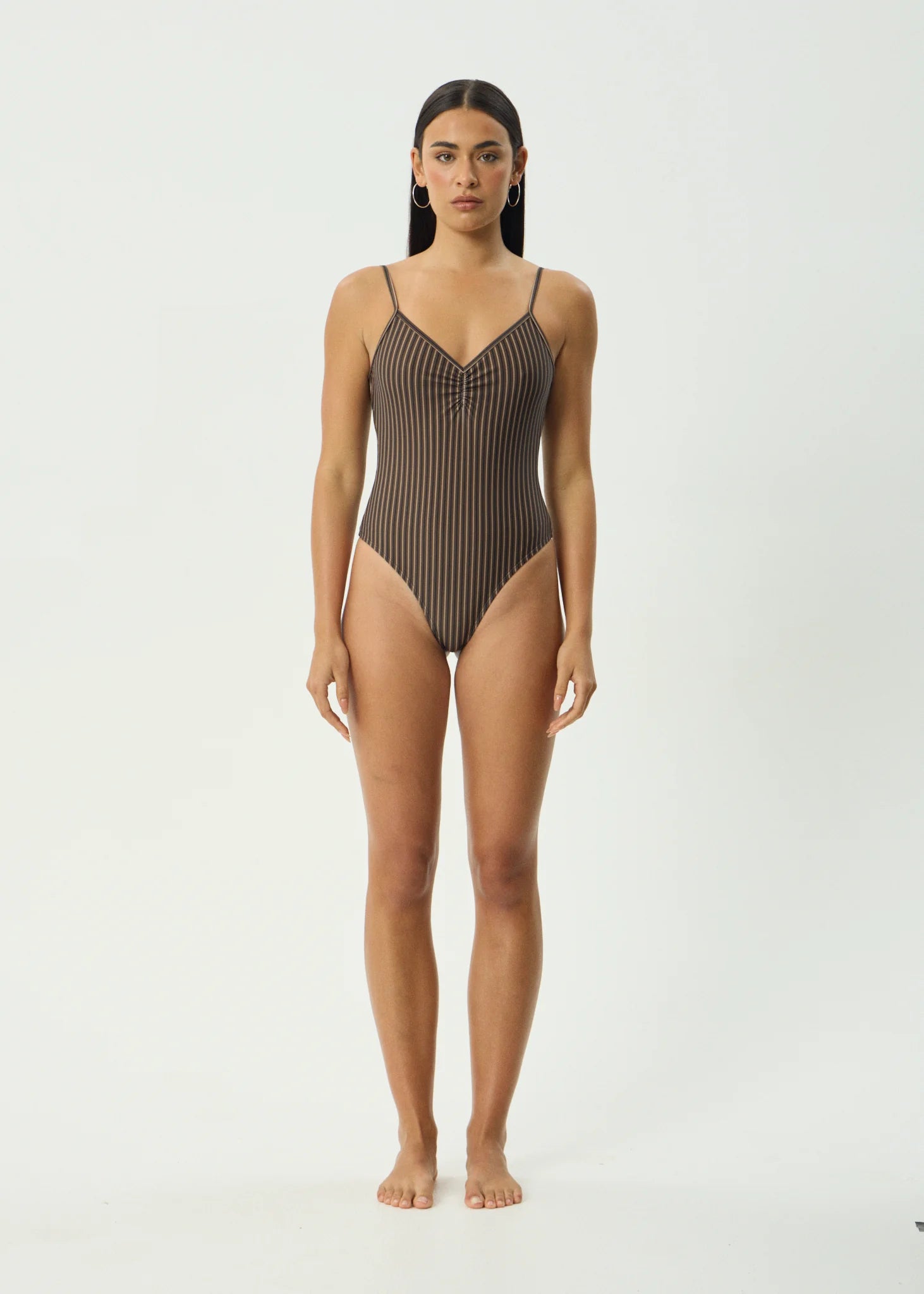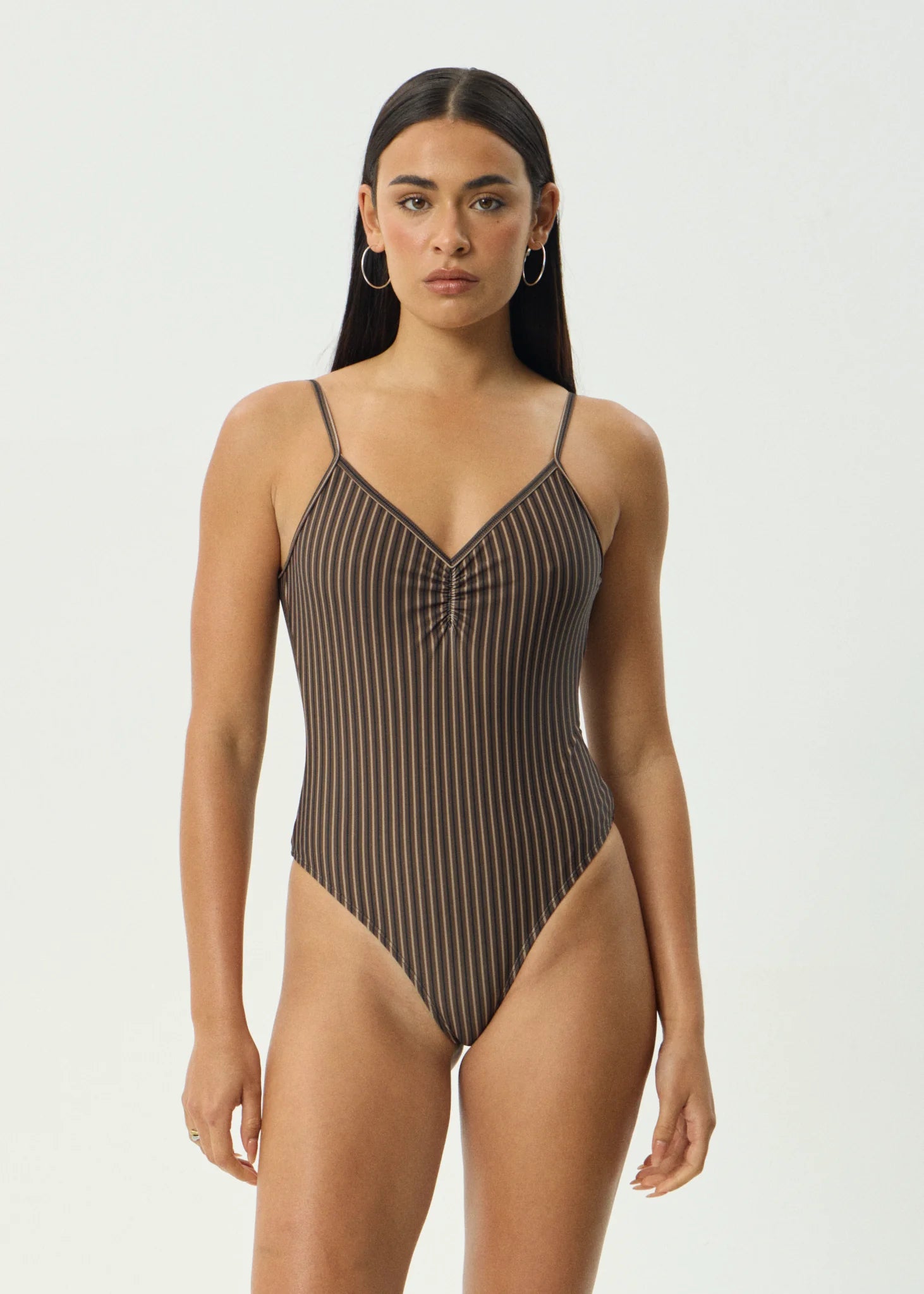 'Cyrus', a flattering, figure hugging one piece. Designed with a tight fit, high cut, skimpy silhouette, v-neckline, scooped back, and centre front ruching for refined texture. Finished with adjustable shoulder straps for a custom fit. Crafted from a recycled nylon blend, this piece is lightweight, quick drying, stretchy, and soft to the touch.