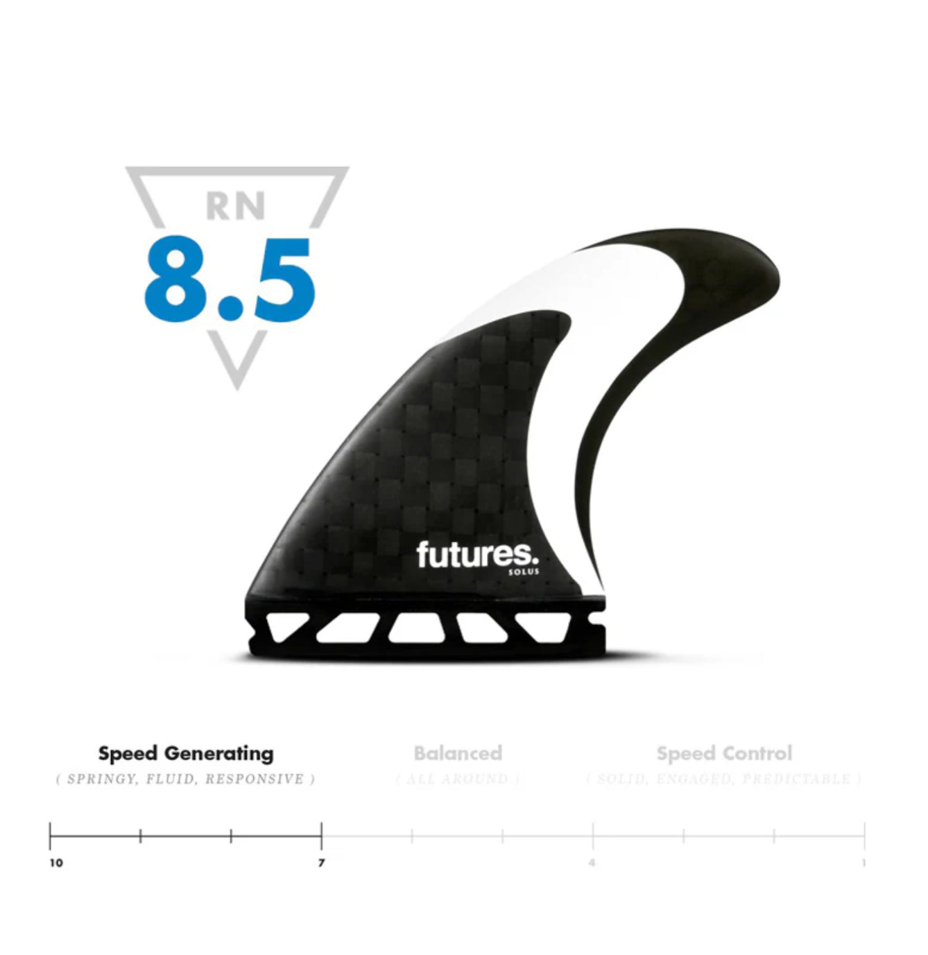 The Solus is a medium sized thruster in the Rake template category. It's a unique set featuring texalium, carbon and honeycomb materials with Futures’ V-Foil, giving this set a responsive flex pattern ideal for generating maximum speed in smaller waves. The Solus has increased tow and cant angles to give extra lift, providing fluid rail-to-rail transitions and seamless re-direction.