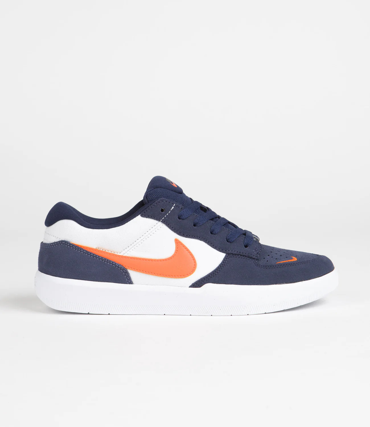 Nike SB Force 58 Shoes in Midnight Navy, Safety Orange and White. Inspired by the brand’s courtside origins and by archived favourites, the Nike SB Force 58 is low-top skate shoe designed with mixed material suede and canvas uppers. Featuring perforated toe box with mini embroidered Swoosh, cupsole construction and grippy rubber outsole, this navy Nike SB skate shoe also features flat laces that secure the padded tongue in place. Finished with contrasting orange leather side wall Swooshes, supportive suede heel brace and with custom printed Nike SB insoles.