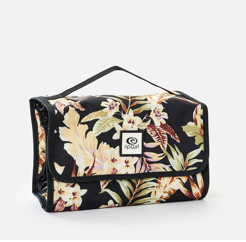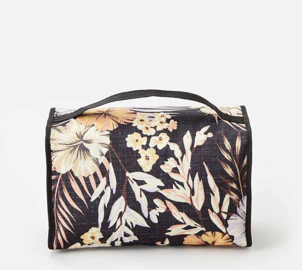 Paradise Rolled Beauty Case from Rip Curl. Features multiple inner compartments, hanging hook, carry handle, Rip Curl logo on the front.