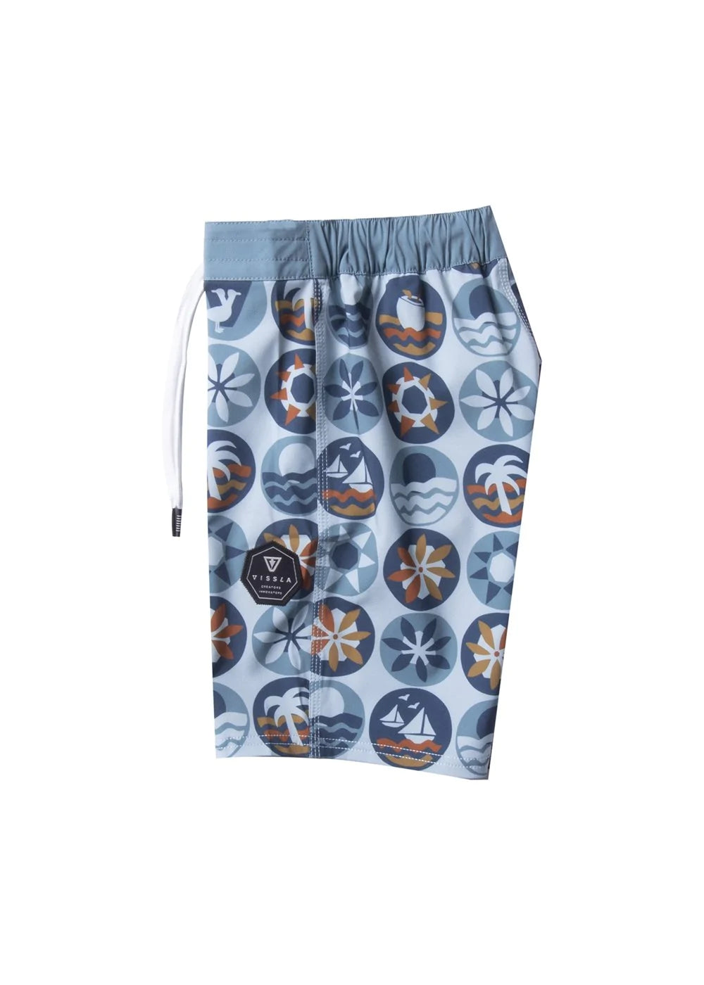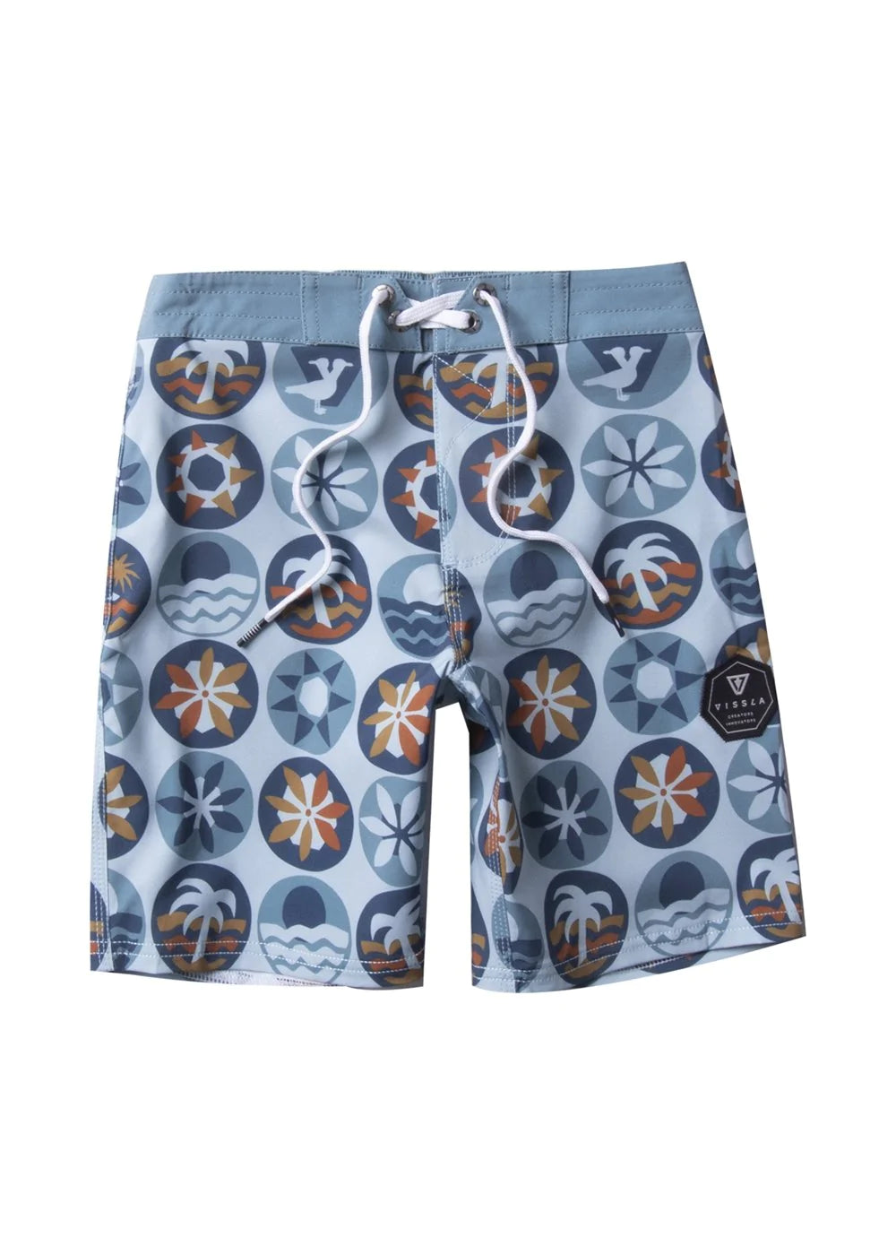 Coastal clip-art surf trunk for the kiddos. The Rounder is a premium 4-Way stretch boardshort made from an eco-friendly blend of recycled polyester Repreve and coconut fibers. Styling includes a back pocket and drawcord waistband with added elastic at back half of waistband for improved fit. 13" outseam.