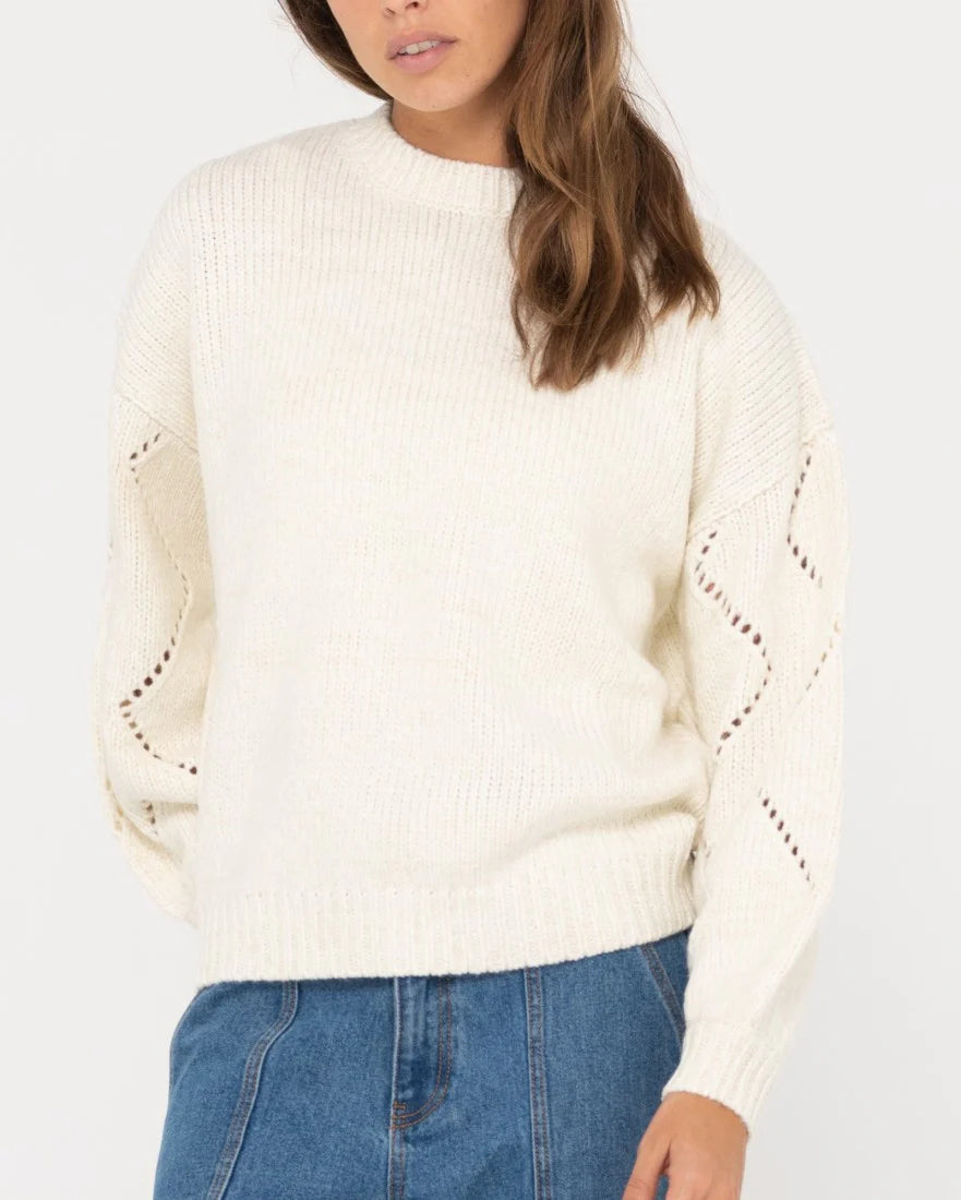 Relaxed Fit Crew Neck Knit With Patterned Design Details And Blouson Sleeve. Material: 100% Acrylic Yarn