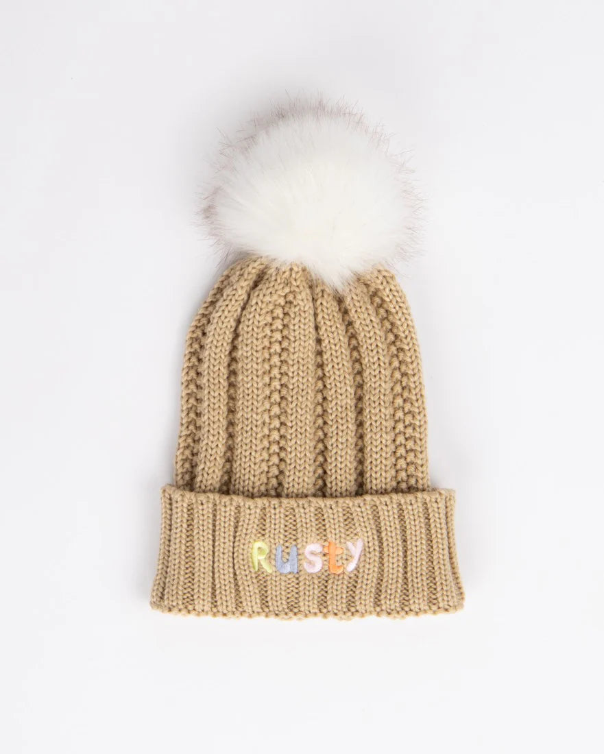 Embroidered Single Layer Beanie With Folded Cuff And Fur-look Pom Pom. Material: Acrylic