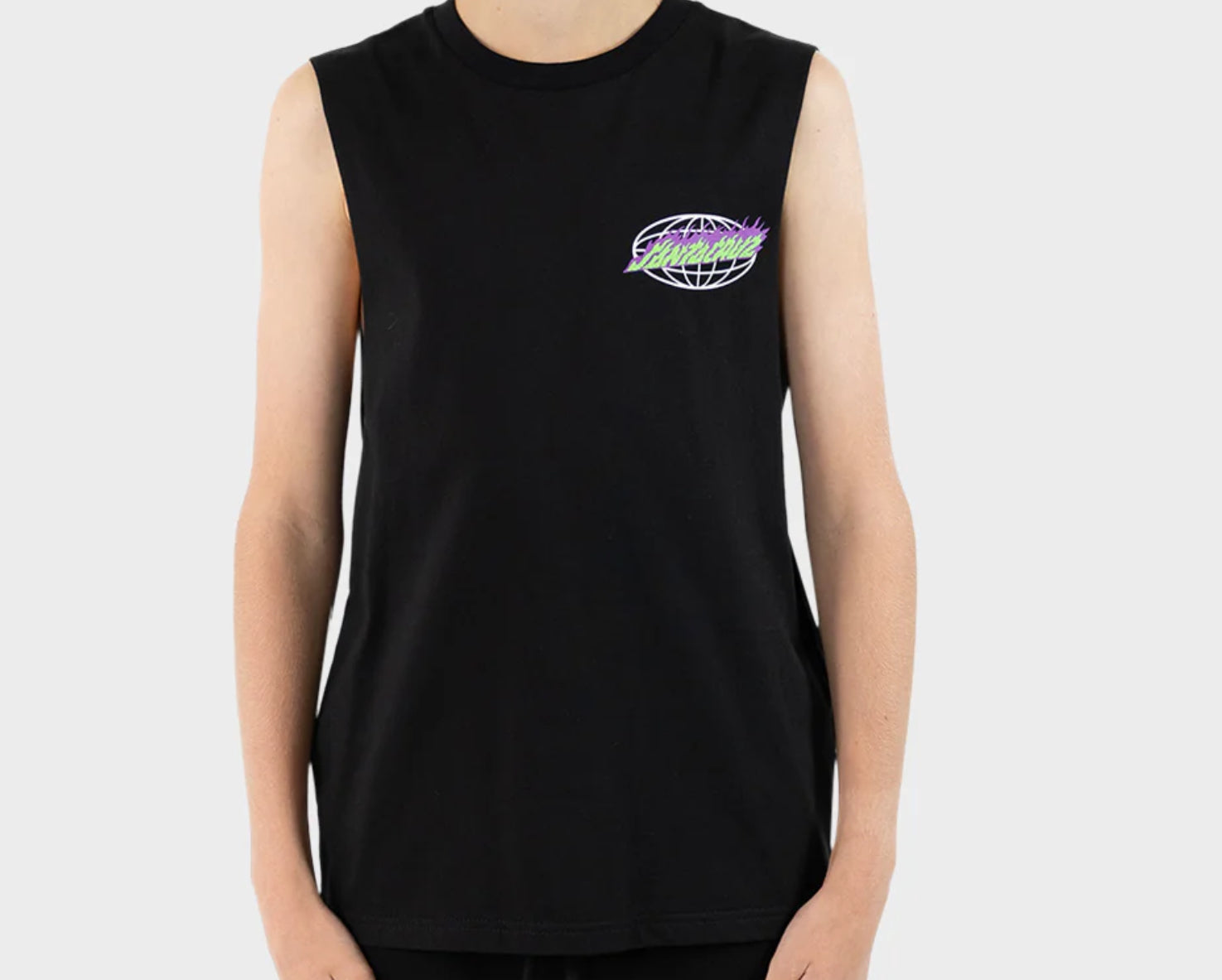 Boys Santa Cruz muscle t-shirt featuring a sponge print of the Global Flame Dot artwork.