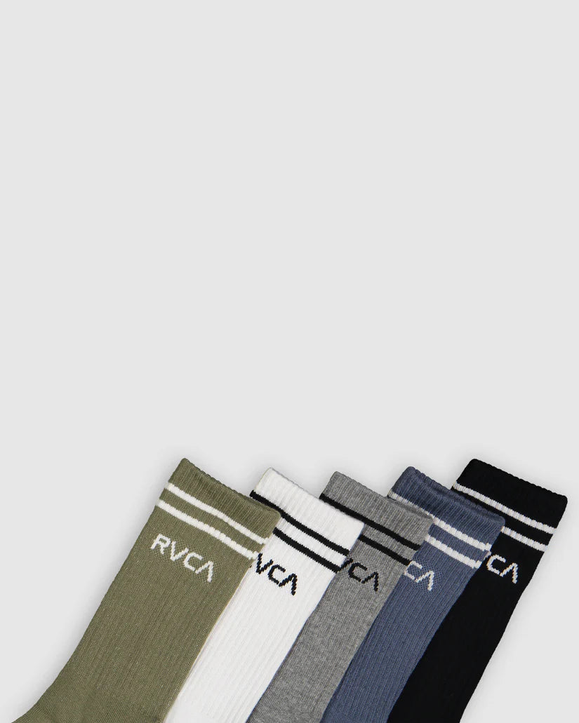 The union sock iii 5 pack comes with 5 pairs of our classic crew styles topped with RVCA and VA details. These solid RVCA logo socks are made from a stretch blend fabrication with a minimalistic design for everyday wear.