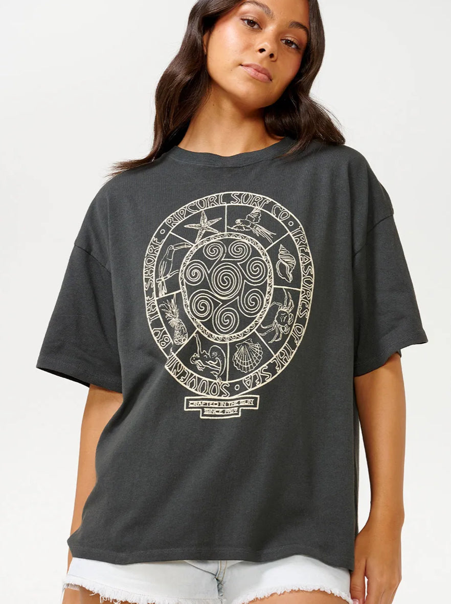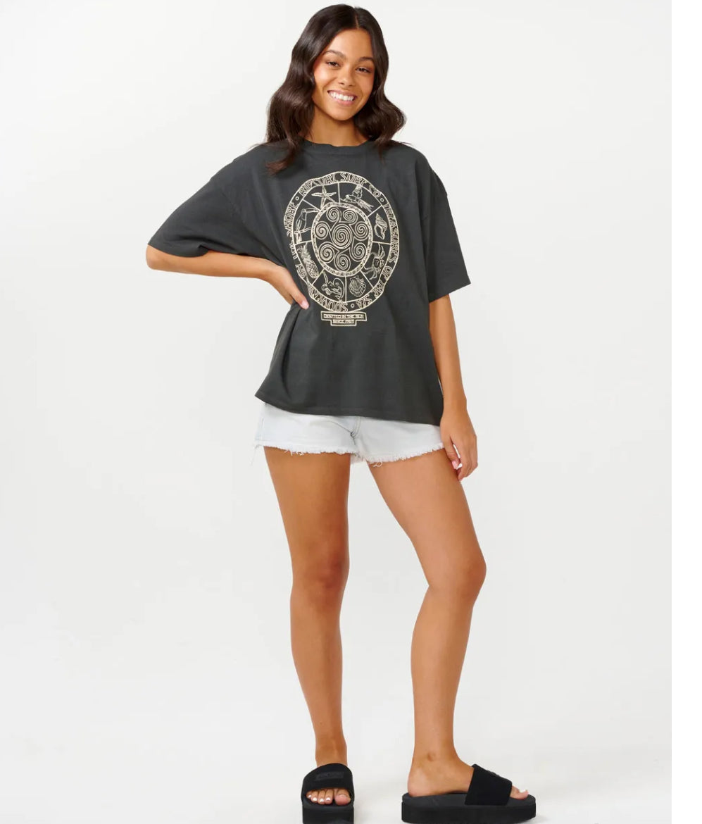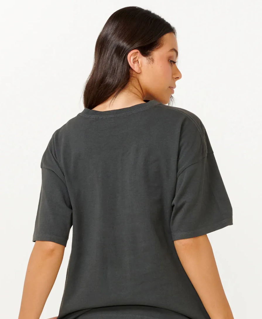 The Souvenirs Heritage Tee is made from 100% cotton jersey with garment pigment dye, heavy enzyme wash, front print, and woven flag label.