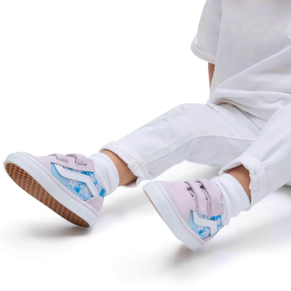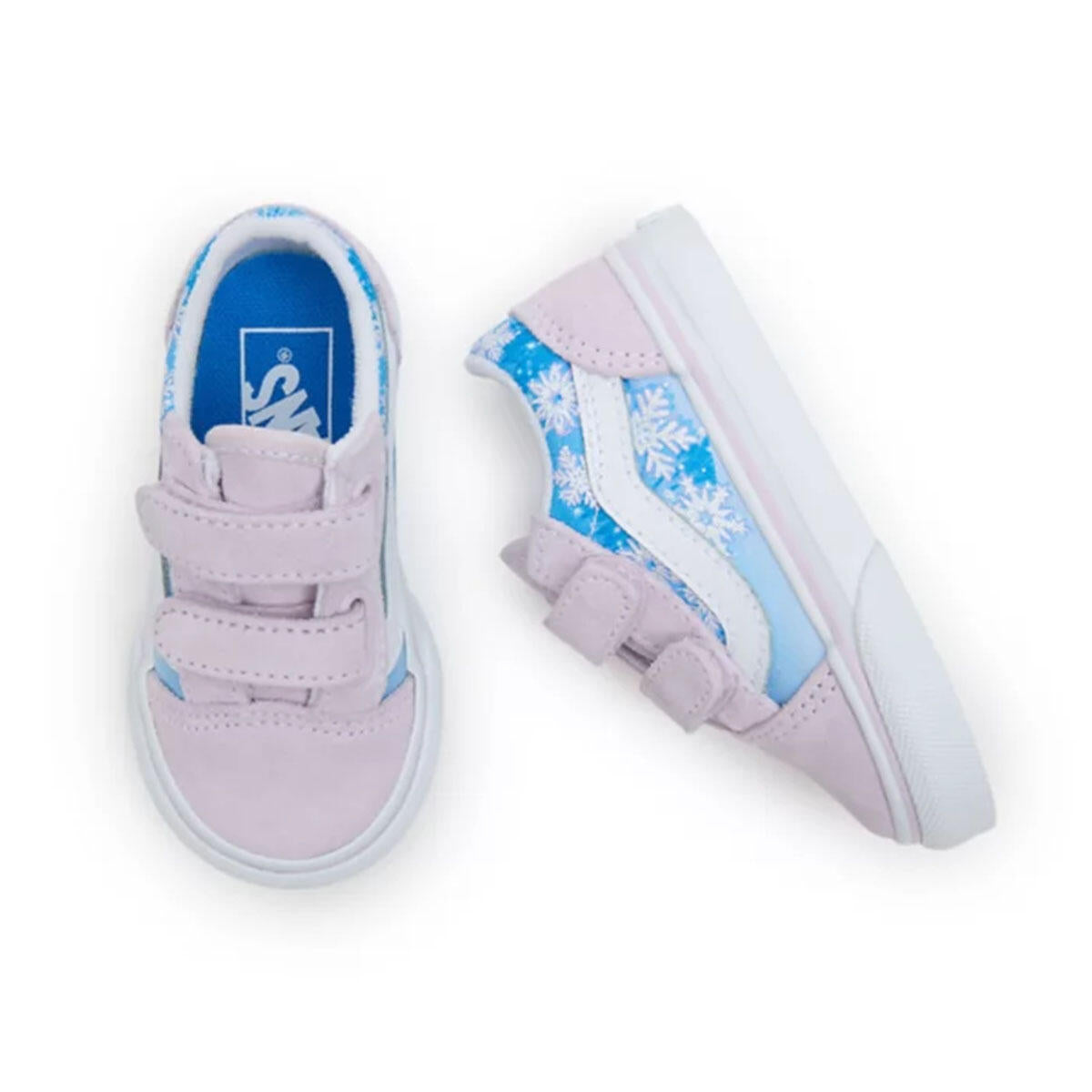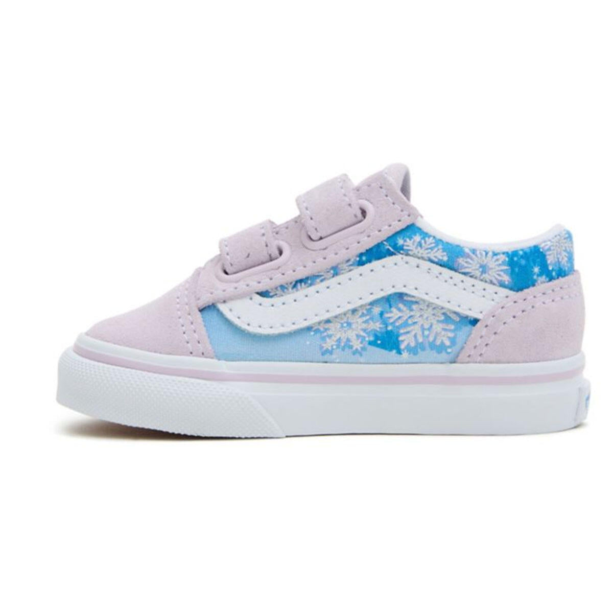 The Toddler Old Skool V reimagines our iconic Sidestripe shoe by swapping traditional laces for double hook-and-loop closures. Making every day a wintery wonderland with glittery snowflakes and magical pops of metallic, this low-top style maintains its classic appeal while providing an easy, secure fit that keeps your little one comfortable all day.