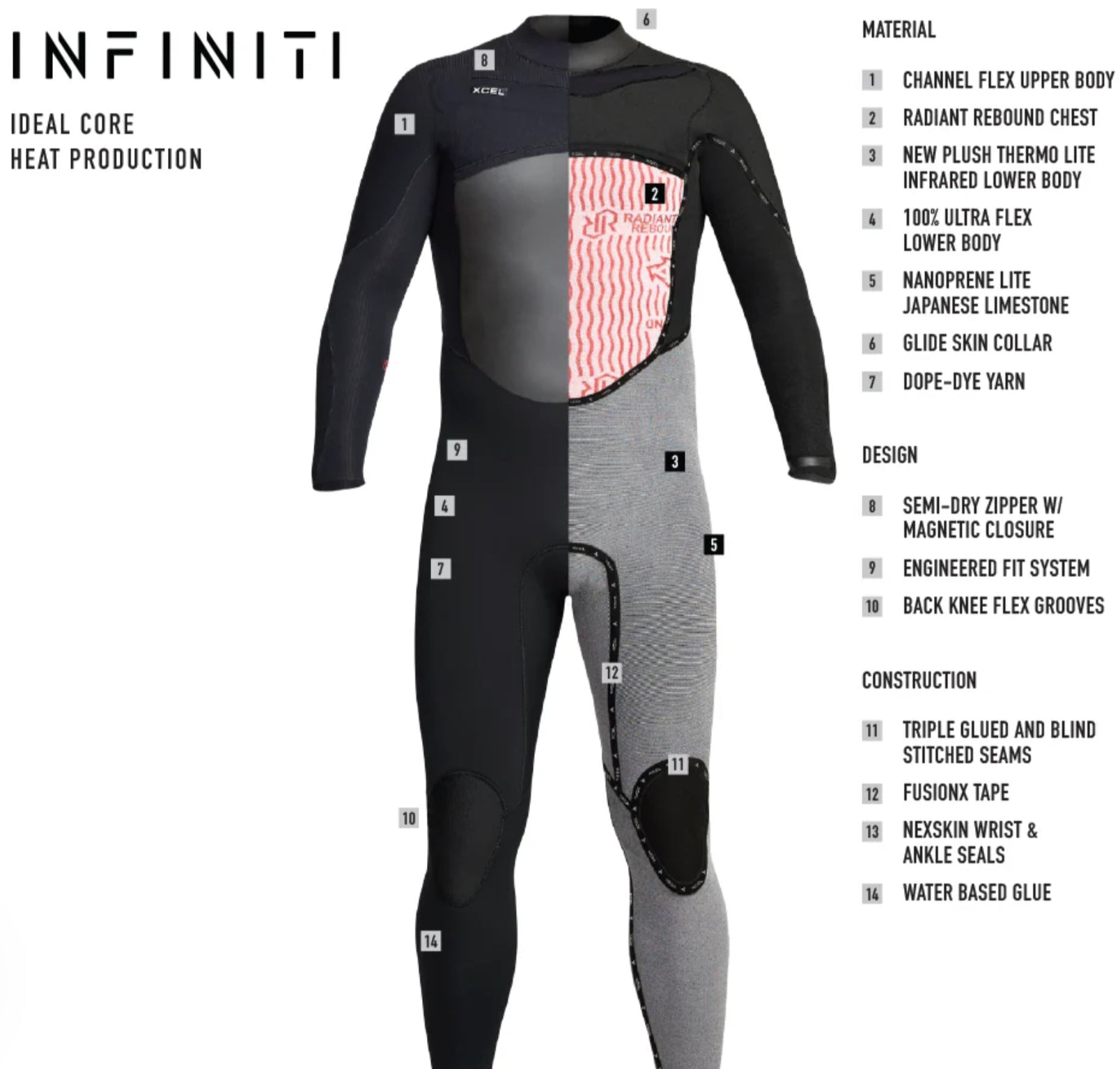 Ideal Core Warmth and Performance. The Infiniti series is the work horse in the Xcel lineup. It offers the perfect balance of warmth and stretch. The Radiant Rebound core locks out cold, while rebounding body’s heat within. ThermoLite IR is used in the lower interior for added stretch and warmth. The exterior of this 4/3mm wetsuit has a Channel Flex upper and Ultra Stretch lower.